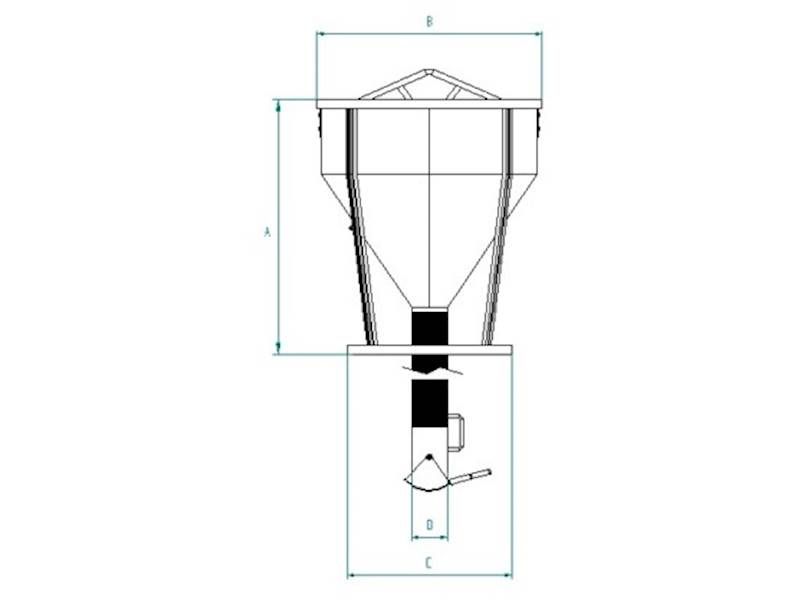 Bádie na beton s rukávem. Výpustní uzávěr na konci rukávu. Průměr rukávu 200 mm umožňuje snadný průtok směsi (možno dodání i v pr. 150 mm, zde ale zúžený a tím i ne tak optimální průtok směsi.